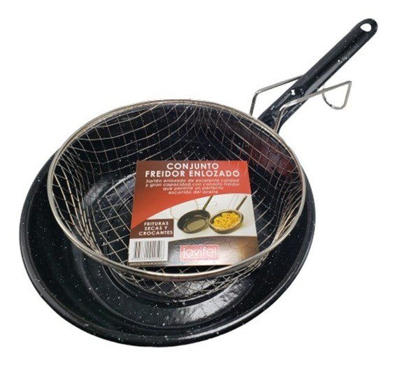 Sartén enlozado de excelente calidad y gran capacidad, con canasto freidor que permite un perfecto escurrido del aceite. Frituras secas y crocantes!